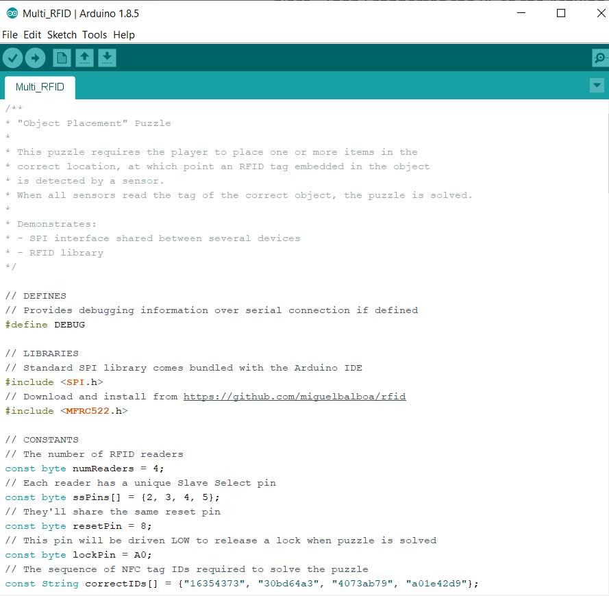 A video I found particularly useful is called Escape Room Object Placement Puzzle using Arduino/RFID. Alastair did an excellent job walking through the design and construction of an object placement puzzle. He also provides a link for downloading the Arduino code, wiring diagram, and additional documentation that allowed me to build the puzzle. I was required to become a Patreon member to access this information, but for me it was well worth it!