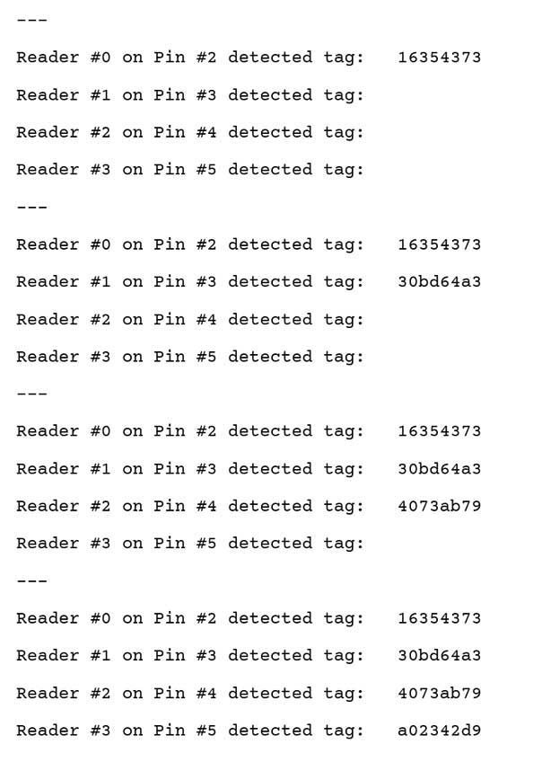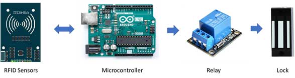 The RFID sensors are circuit cards designed to look for a specific signature from an ID card or key fob. The intended design and use of these cards is for key card / smartcard security access. In other words, the cards and sensor are an alternative to using key locks for access through doors, gates, etc. When a key card with the correct signature is placed near the RFID sensor, the sensor communicates this to the microcontroller.