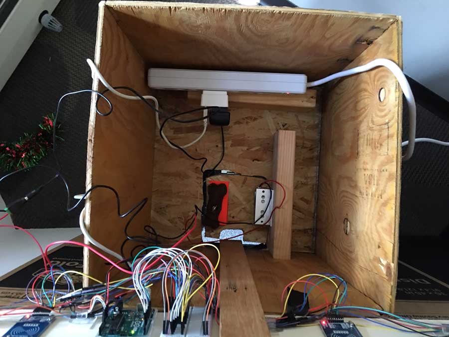 Then Ace and Amy attached the magnetic lock to the trap door at the bottom of the boxlike structure and we tested the unit. We further tested operation during the room beta-testing.