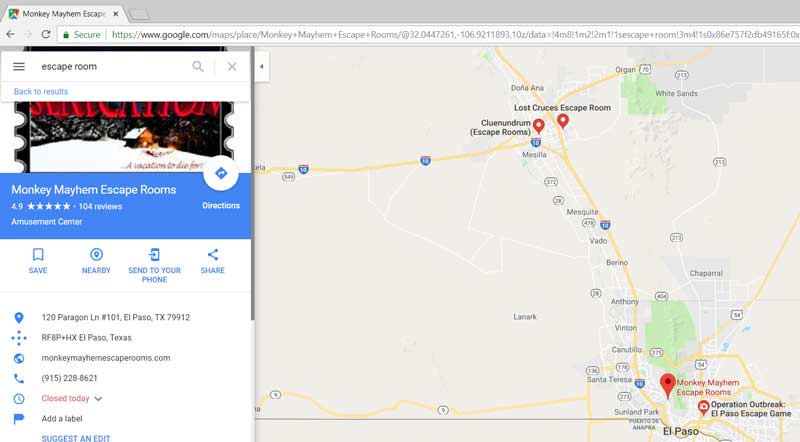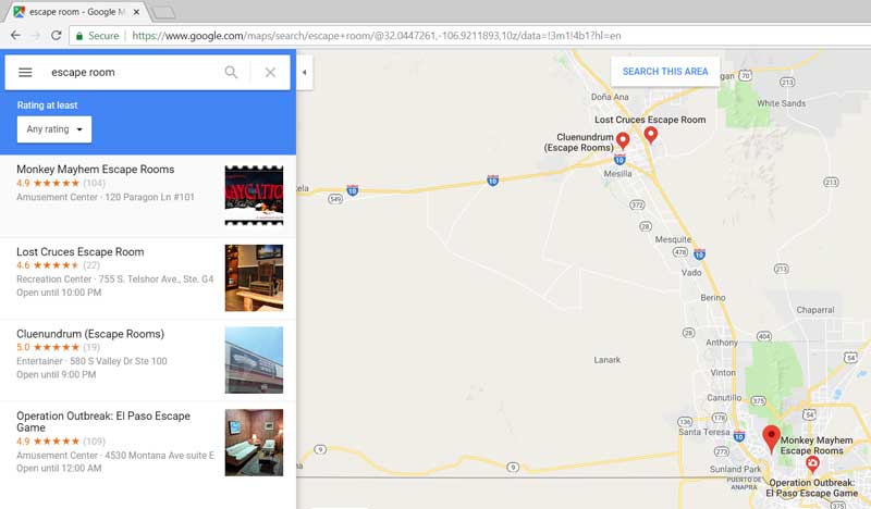 For example, if one navigates to Google Maps and searches on “escape rooms”, they should see results returned relative to the default search location in the individual’s web browser. The business name, rating, numbers of reviews, business category, and address are identified for all business showing up in the results in a window referred to as the Google Search window.