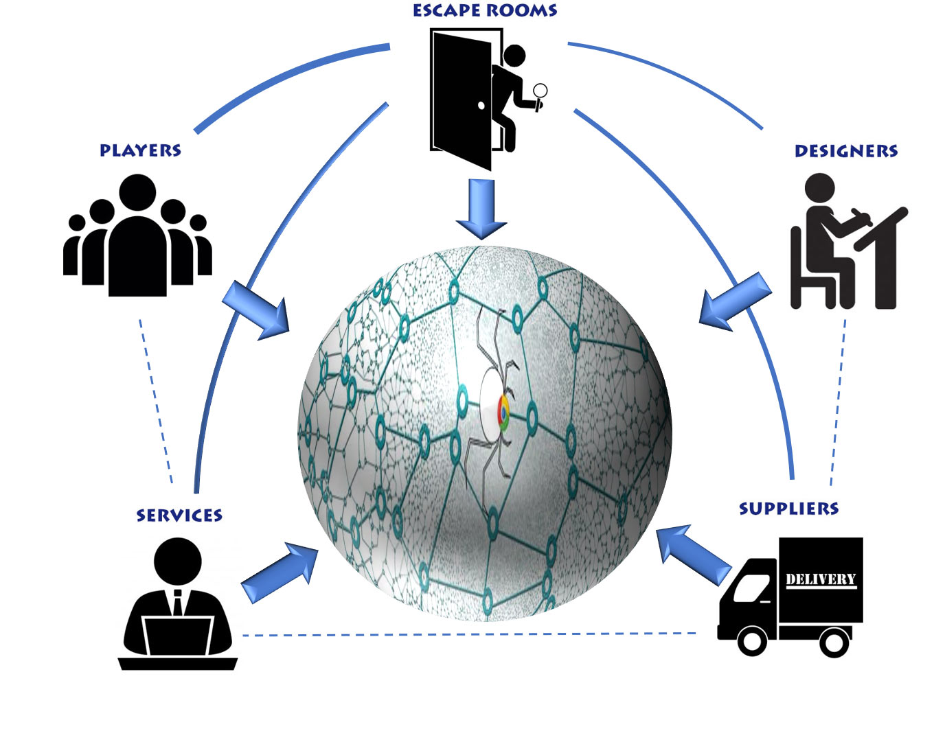 So how does one provide a framework for enhancing and facilitating relevant information via community interaction? Let’s look at an example of what the segments/roles and relationships of the escape room industry might look like: