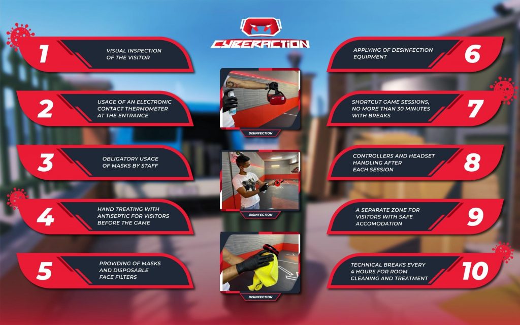 Having analyzed the worldwide experience, for arena proprietors, Virtuactions has developed recommendations that can guarantee visitors relative safety while visiting the game. Once all the rules are followed, the risk of virus infection is reduced by 85%. It is based on a careful approach to the examination of visitors using electronic thermometers, processing of equipment after each VR battle, the use of antiseptics and medical masks.