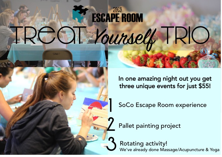 We also host special events. Book a duo and you get an escape room and another awesome activity like pallet painting or building a macrame mini hanging succulent garden. Book a trio and you get an escape room along with two activities like 10 minute chair massages or making a DIY dog toy! These are absolutely fantastic for team building events or parties.